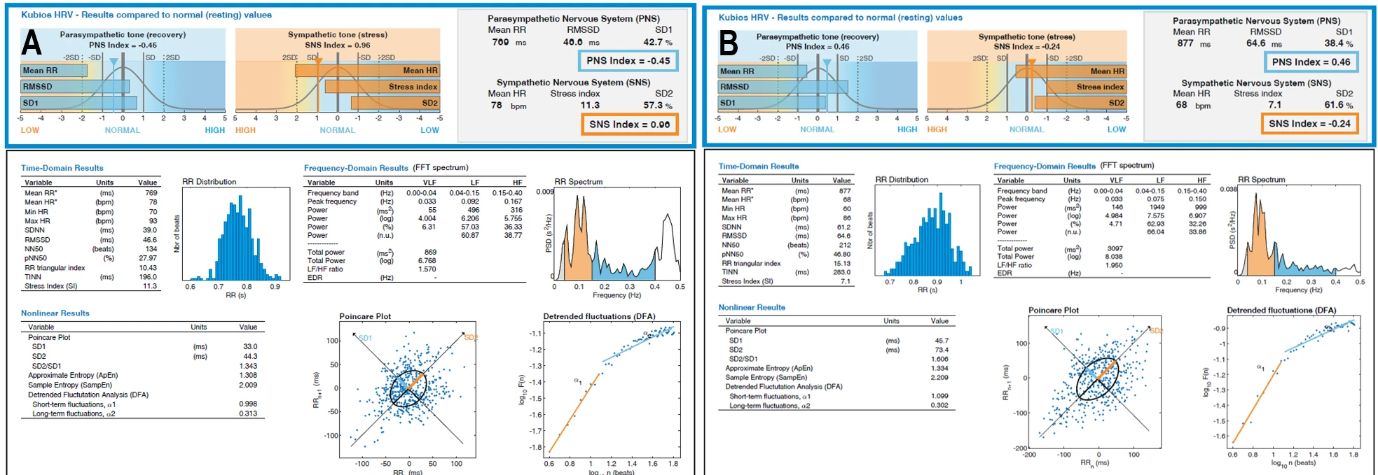 Figure 1-1. HRV Profile (Eyes Open) Before and After a 40-Day Mountain Expedition Combined with Digital Detox. (A) HRV Profile – Before (Eyes Open); (B) HRV Profile – After (Eyes Open).