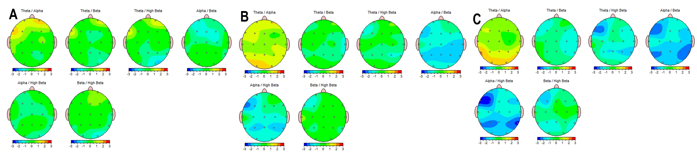 Figure 2-1. EEG Topographic Maps of Frequency-Band Ratios Before a 40-Day Mountain Expedition Combined with Digital Detox. (A) Eyes Closed; (B) Eyes Open; (C) Video Watching. Pre-intervention z-score topographic distributions (−3 to +3) for multiple EEG frequency-band ratios, including Theta/Alpha, Theta/Beta, Theta/High Beta, Alpha/Beta, Alpha/High Beta, and Beta/High Beta. Each scalp map illustrates spatial patterns of relative power ratio deviations across recording sites under the three behavioral conditions before the expedition.