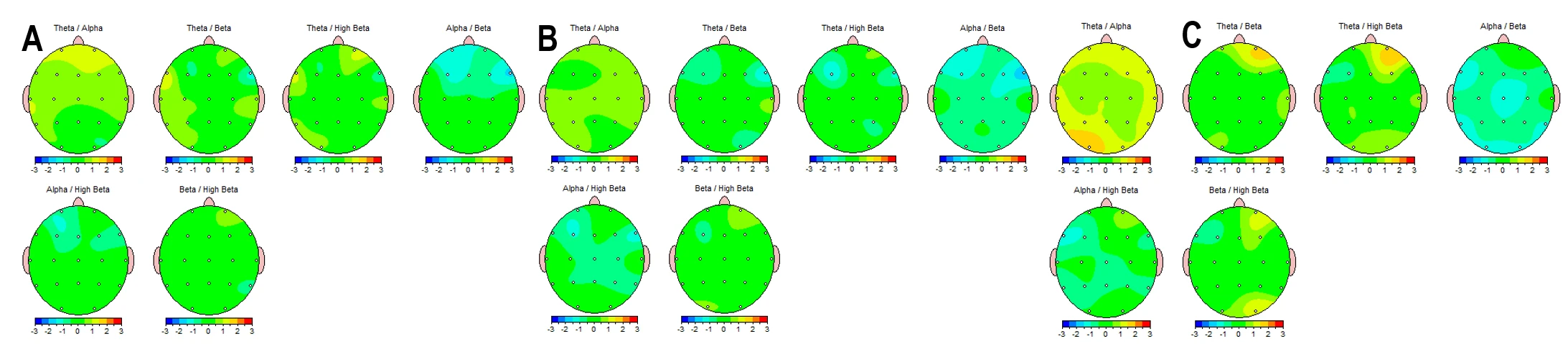 Figure 2-2. EEG Topographic Maps of Frequency-Band Ratios After a 40-Day Mountain Expedition Combined with Digital Detox. (A) Eyes Closed; (B) Eyes Open; (C) Video Watching. Post-intervention z-score topographic distributions (−3 to +3) for multiple EEG frequency-band ratios, including Theta/Alpha, Theta/Beta, Theta/High Beta, Alpha/Beta, Alpha/High Beta, and Beta/High Beta.