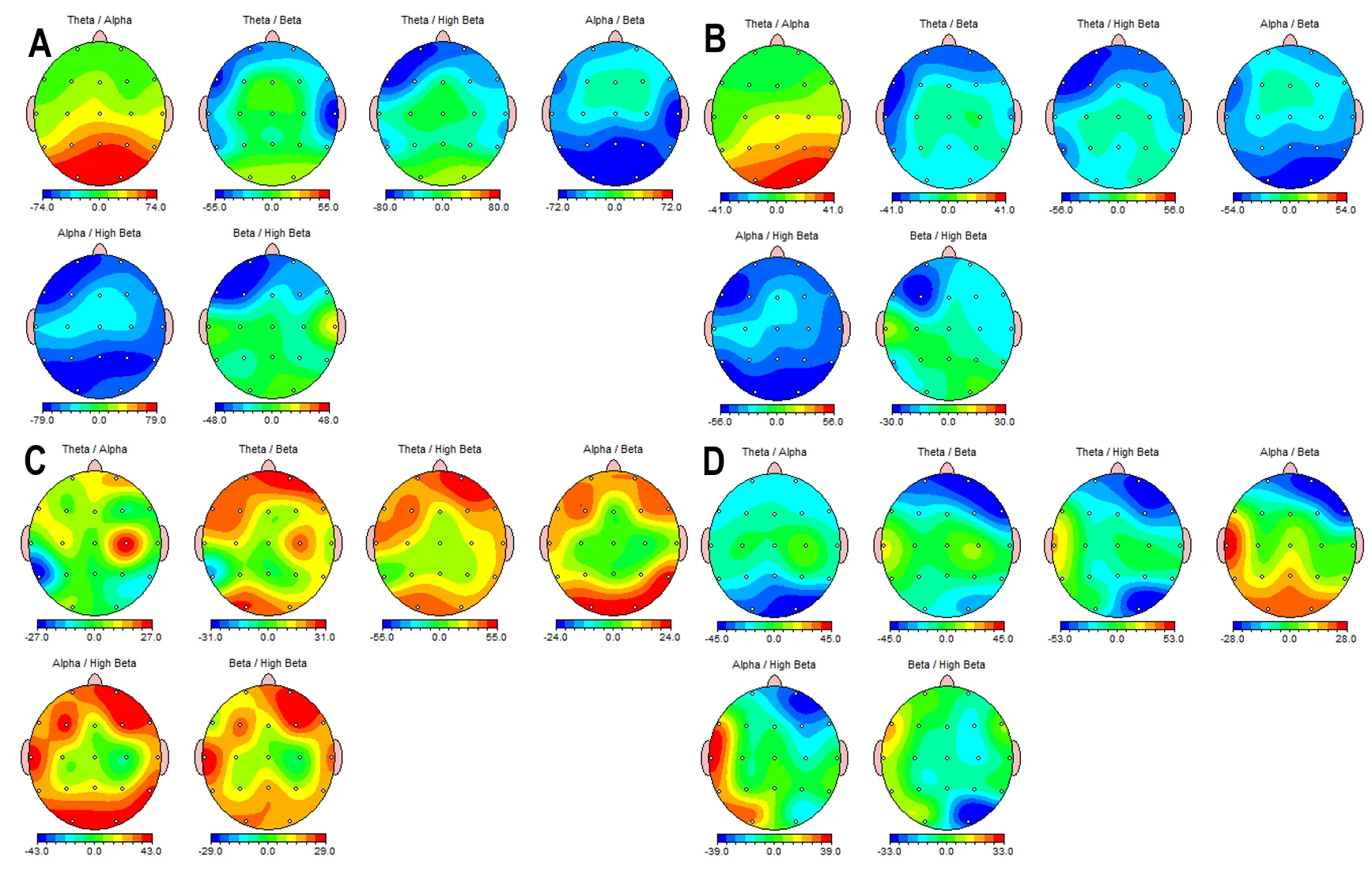 - Alpha/High Beta index showed significant suppression (deep blue regions) in the temporal and parietal lobes.
