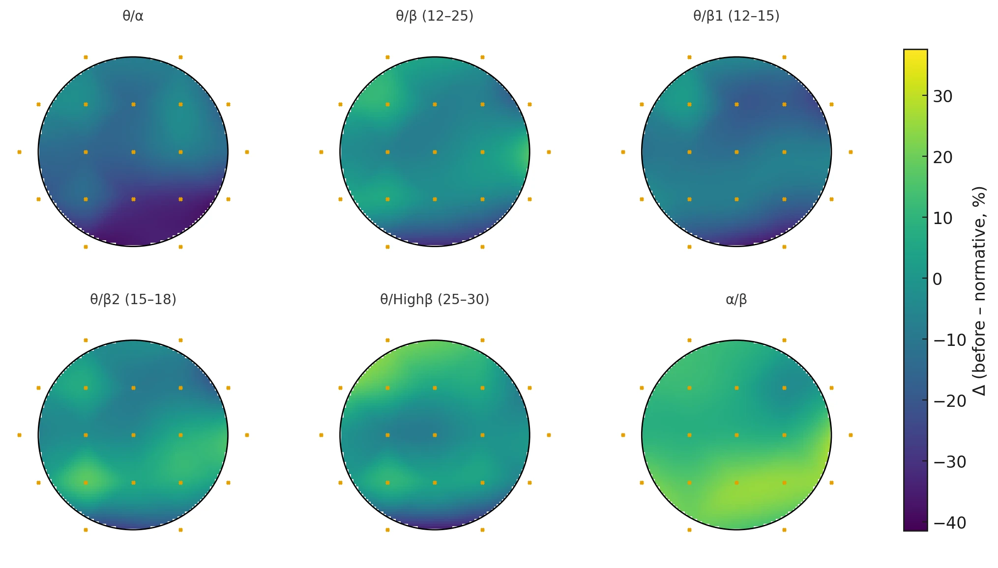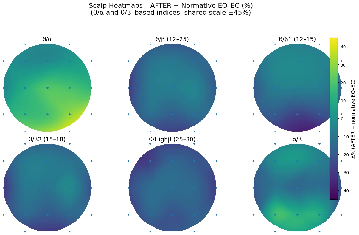 The EO–EC contrast operationalizes a canonical electrophysiological phenomenon: eye opening typically suppresses posterior alpha activity (the “Berger effect”), and the magnitude of this suppression is often treated as a marker of background reactivity to visual input. (Bazanova et al., 2017) Our normative heatmaps (Fig. 2-4 and Fig. 2-5) extend this concept from alpha power alone to a family of ratio indices (θ/α, θ/β variants, θ/Highβ, α/β), thereby characterizing whether the EC→EO transition is dominated by slow-wave relative activity (higher θ-relative ratios) or by faster activity (lower θ-relative ratios), and whether alpha remains disproportionately expressed relative to beta (α/β elevation). The post-intervention reduction in EO–EC percent-change extremes (Fig. 2-3A vs 2-3B) is consistent with a more moderated state shift and may reflect improved regulation of arousal transitions rather than simply “more” or “less” activation.