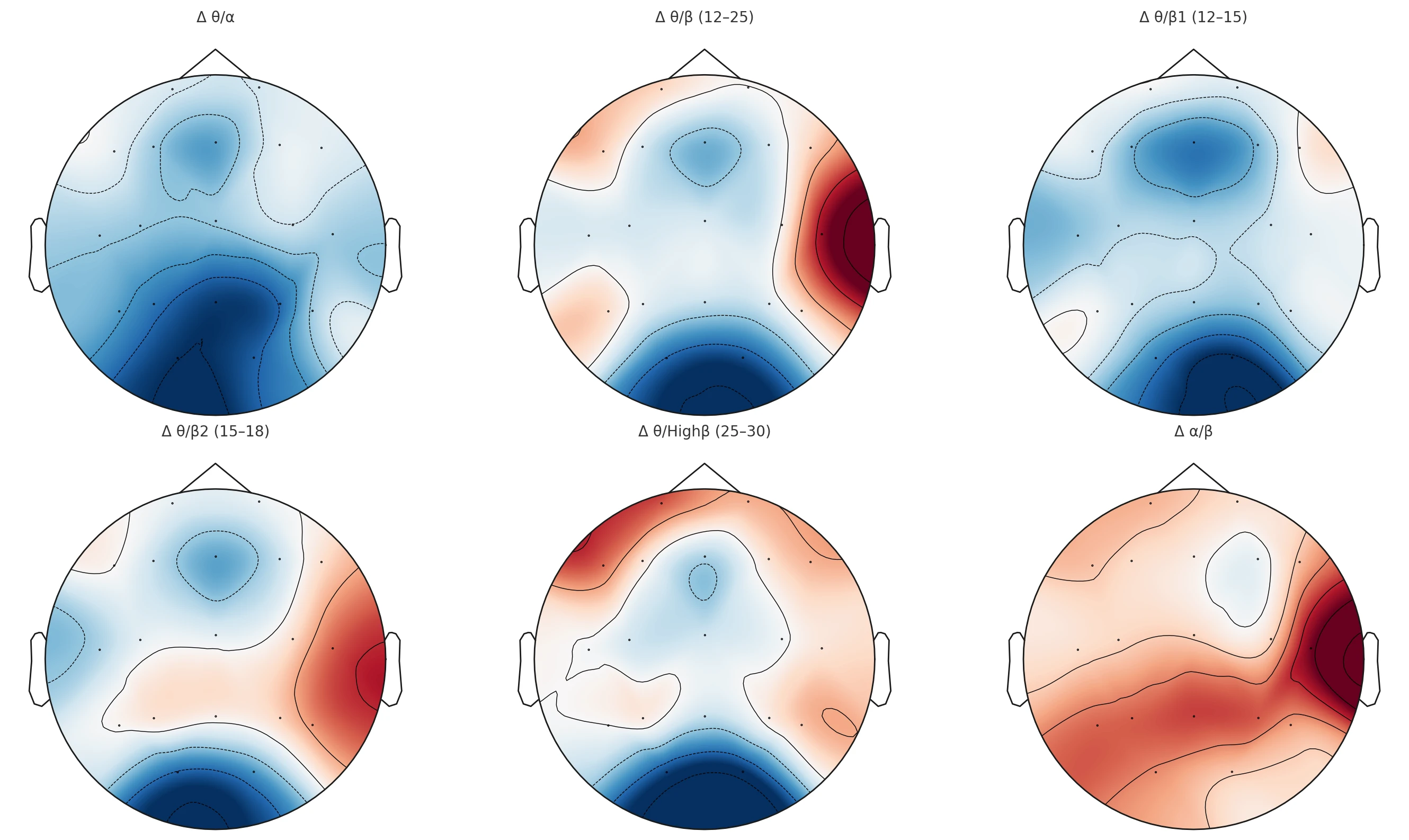 Figure 2-6. Six-Panel EEG Scalp Heatmaps of Δ Frequency-Band Ratios (After – Before) Under the Eyes Open – Eyes Closed Contrast. Topographic maps illustrate post-intervention changes in key EEG ratio indices computed as Δ = (After – Before) for the contrast Eyes Open minus Eyes Closed (EO–EC). The six panels represent: (1) Δ θ/α, (2) Δ θ/β (12–25 Hz), (3) Δ θ/β1 (12–15 Hz), (4) Δ θ/β2 (15–18 Hz), (5) Δ θ/Highβ (25–30 Hz), and (6) Δ α/β. Color gradients depict relative increases (warm colors) and decreases (cool colors) in ratio magnitude across scalp regions, highlighting spatial patterns of neurophysiological modulation following the 40-day mountain expedition and digital detox.