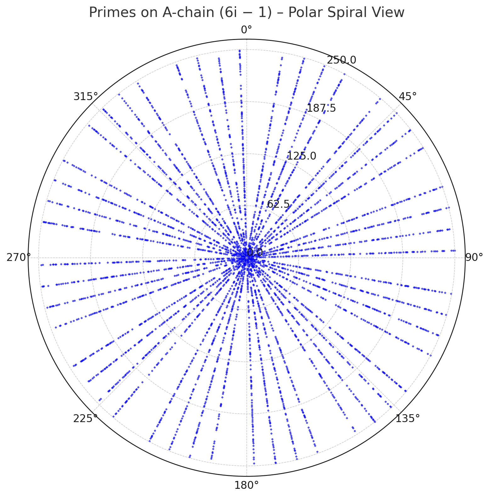 Figure 1. Primes on the A-chain (6k−1) plotted in polar coordinates by residue modulo 360; points align on admissible rays.