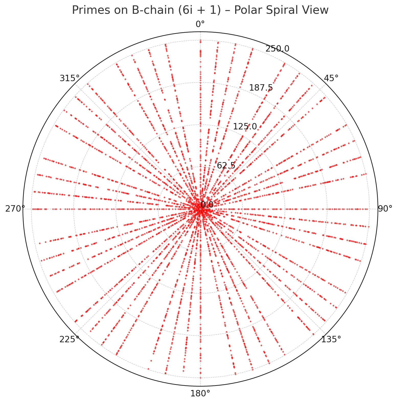 Figure 2. Primes on the B-chain (6k+1) plotted in polar coordinates by residue modulo 360; points align on admissible rays.